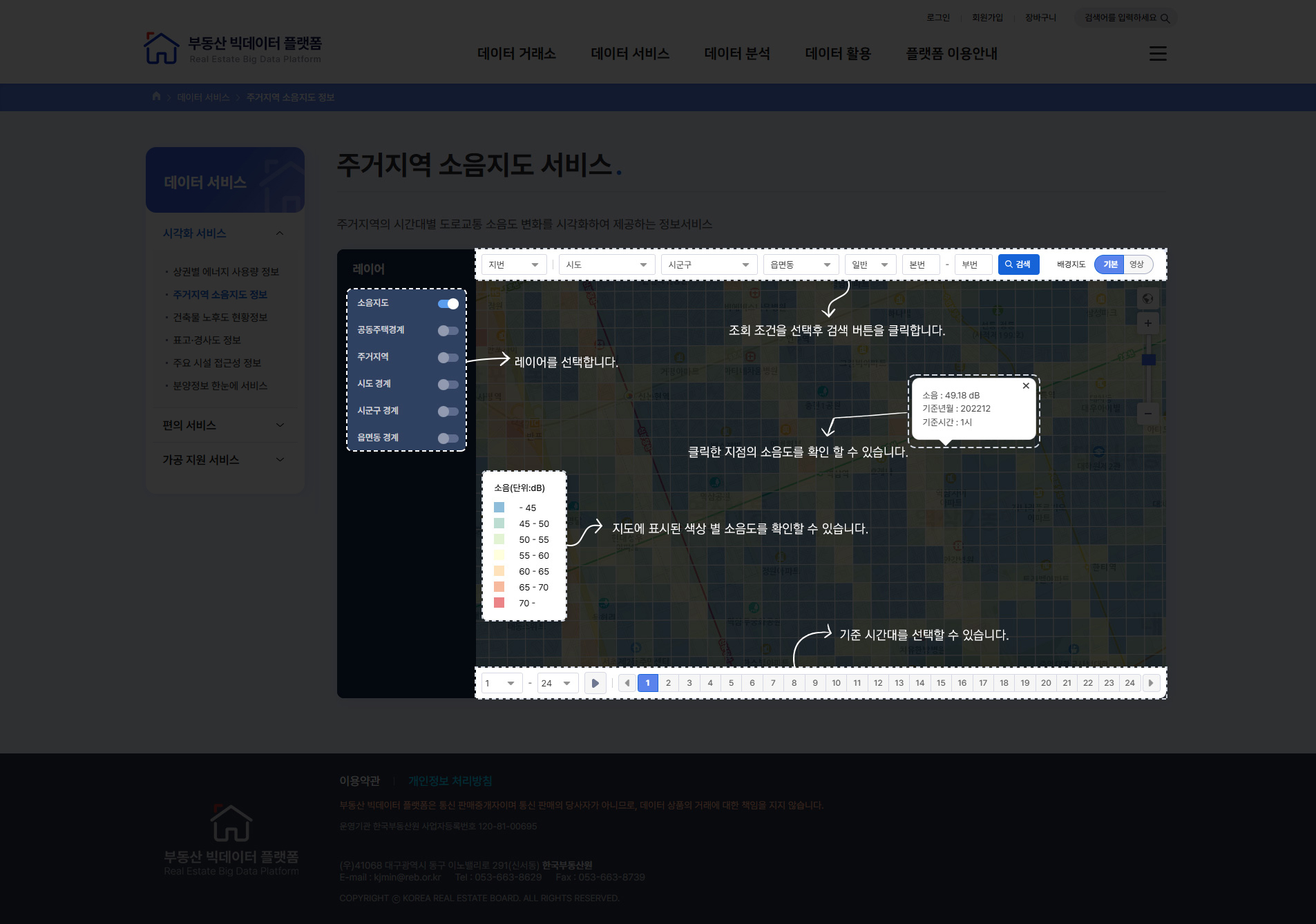 주거지역 소음지도 정보서비스 이 페이지는 PC에서 접속해 주세요. 이 페이지는 콘텐츠 특성상 모바일 버전을 제공하지 않습니다. 뒤로 이동 홈으로 이동 주거지역의 시간대별 도로교통 소음도 변화를 시각화하여 제공하는 정보서비스